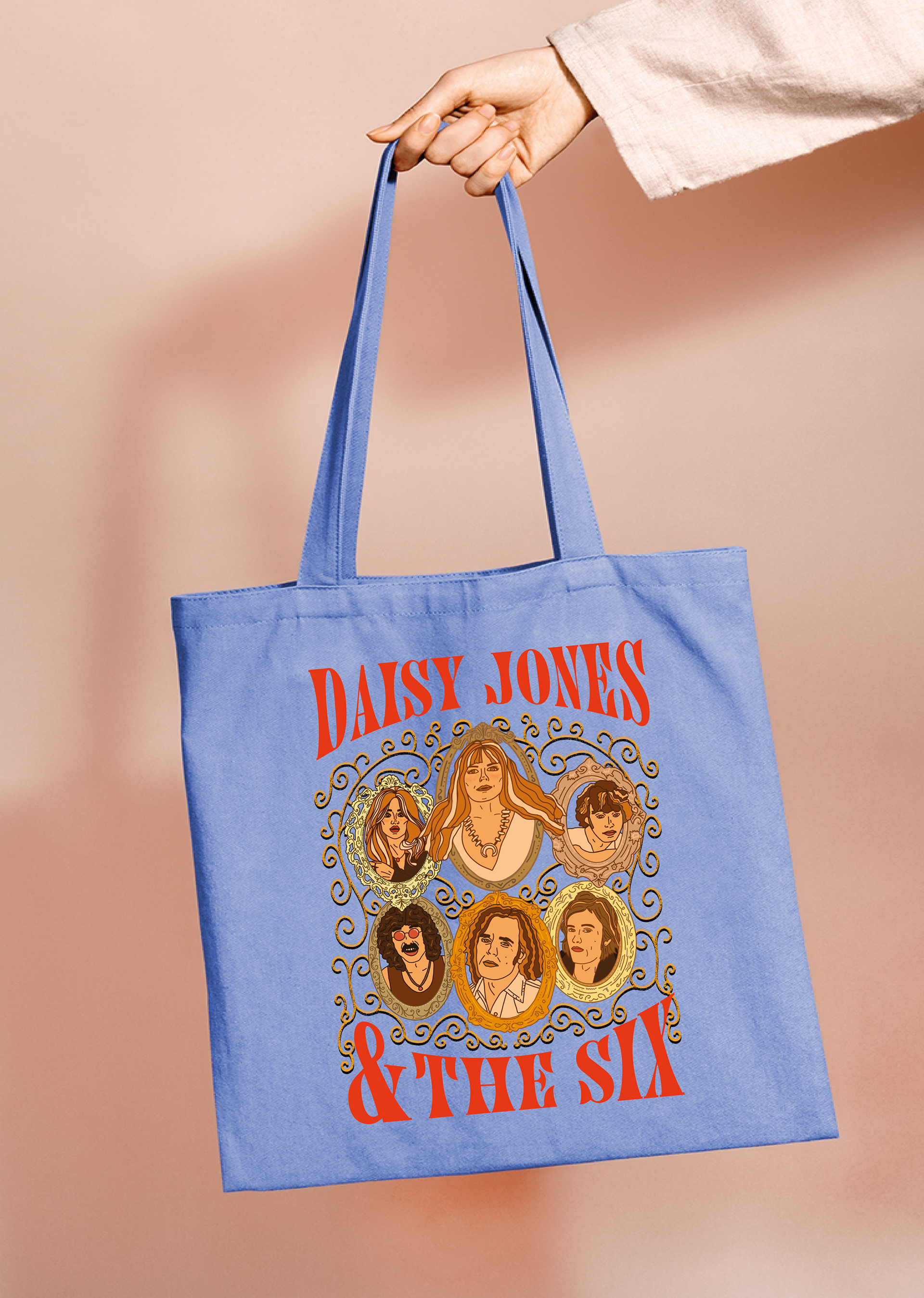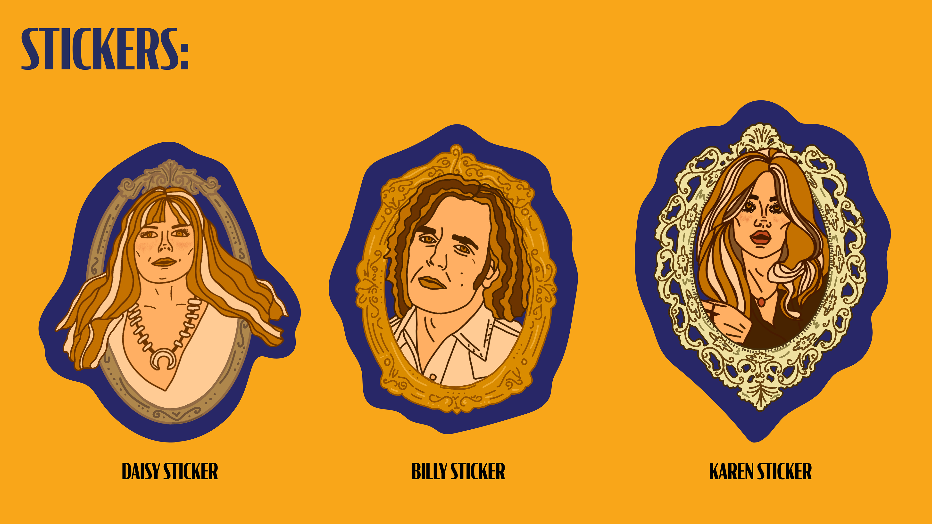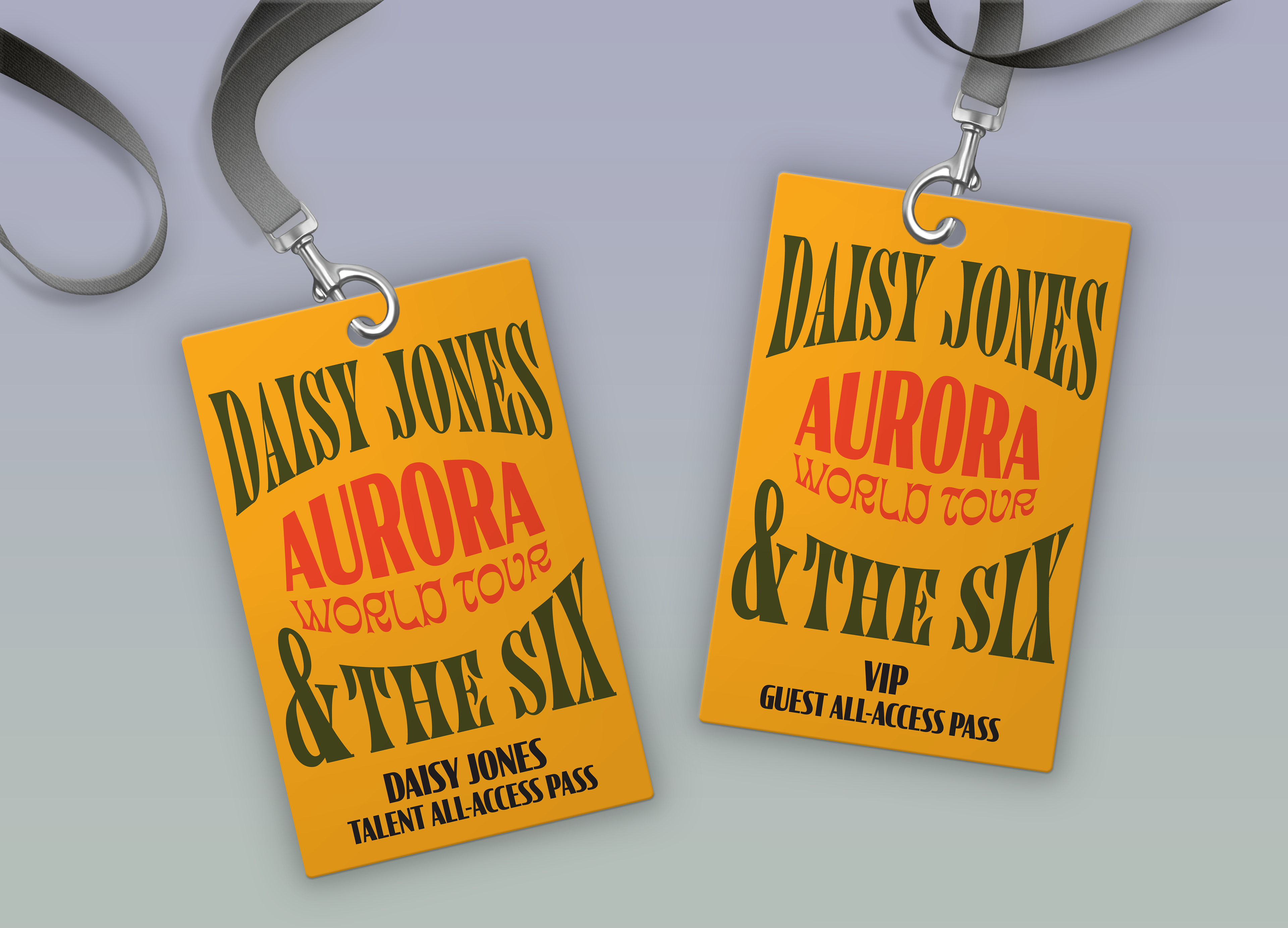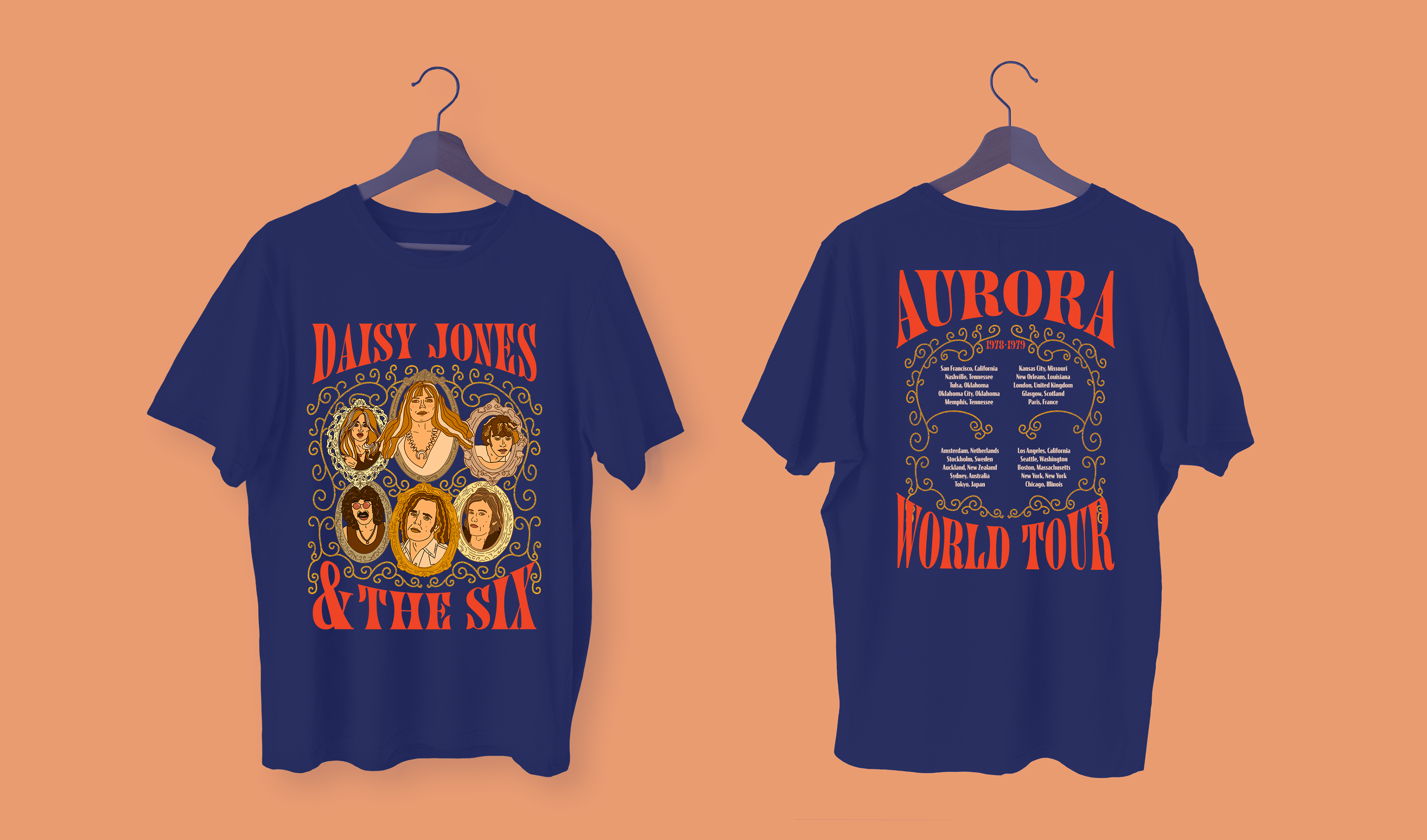 Created for independent study at UCF for Fall 2023. For my independent study I wanted to focus on an area of interest in design that I had but didn’t really get the chance to explore much in classes, which was merchandise design for music. I created a tour branding system for the fictional band by Taylor Jenkins Reid, Daisy Jones & The Six. They are a seventies rock band reminiscent of Fleetwood Mac. I designed a few logo variations and various merchandise items including a poster, tote bag, shirts, bracelets, stickers, and more. The poster and merchandise including the imagery of the band is custom illustration that I did myself in Procreate. This project sparked my interest in this niche of design even more and I had such a blast creating this line.